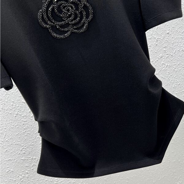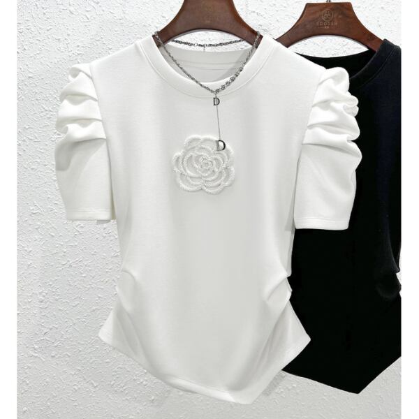 フラワーステッチ ギャザースリーブ ソリッド トップス 235800