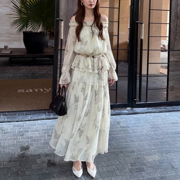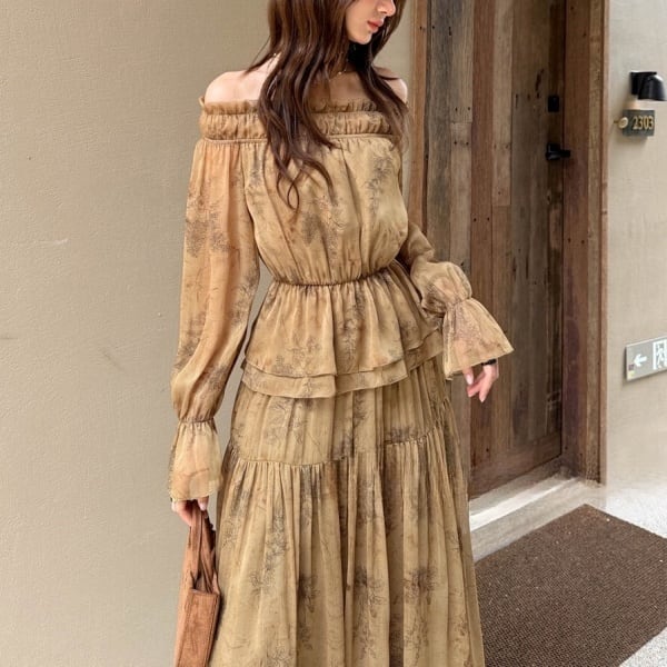 【Setup】オフショル シフォン ブラウス&ティアード スカート 237142