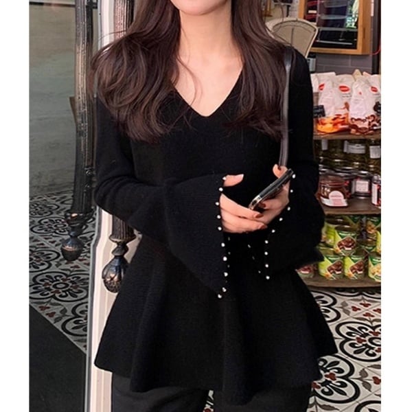 Vネック フレアスリーブ ビジュー付き ニットプルオーバー 238610