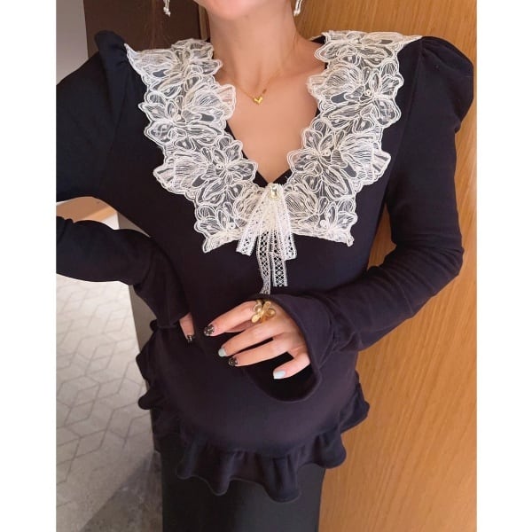 ビッグ レース カラー V ネック ロング スリーブ ニット 238672