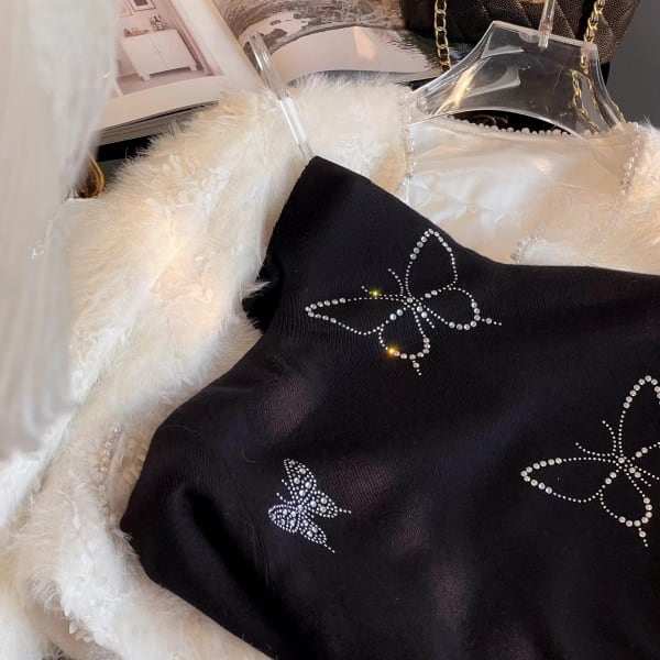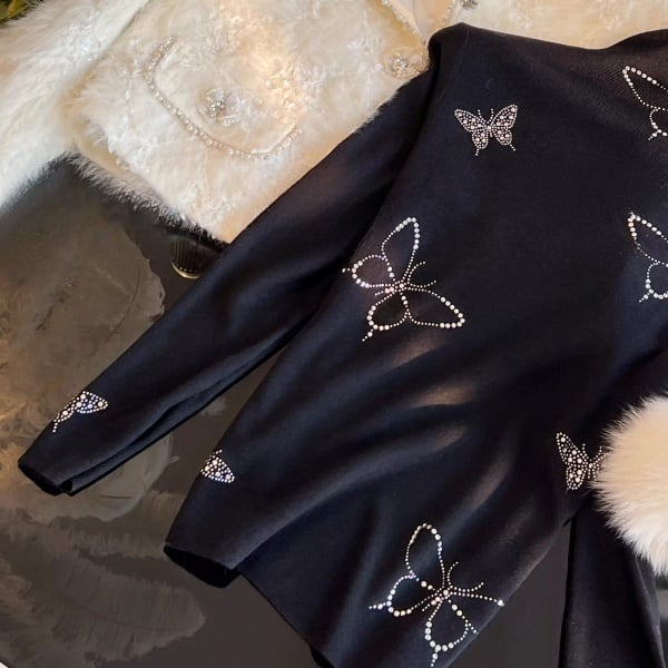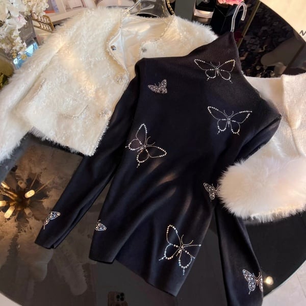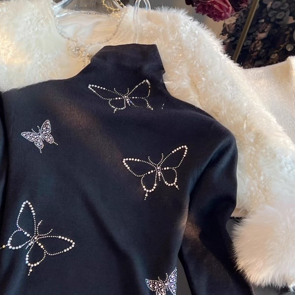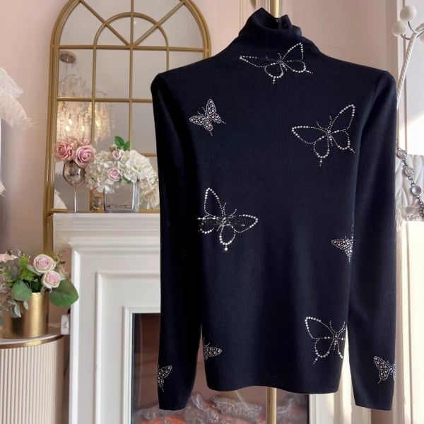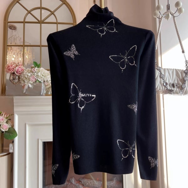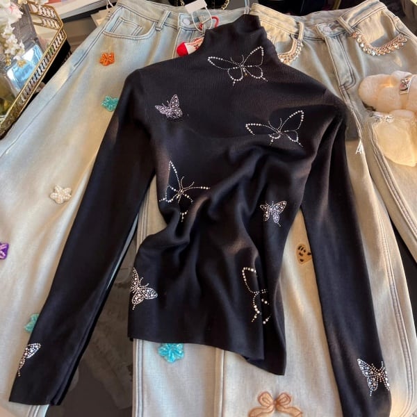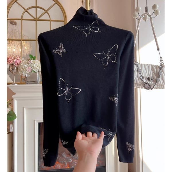 バタフライ ラインストーン ビジュータートルネック ニット 239186