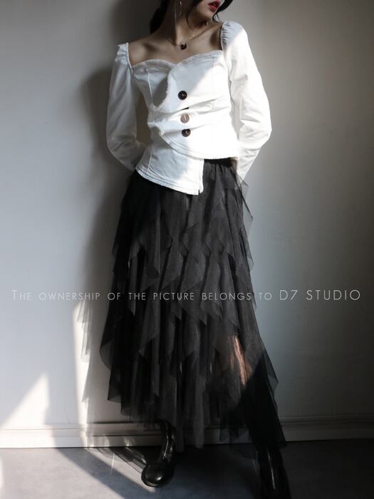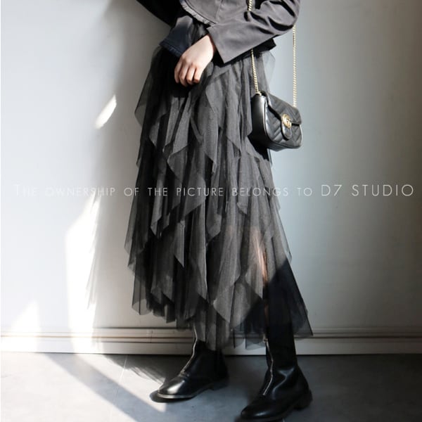 たっぷりのチュールが美しいスカート。縦落ちシルエットだから、主張しすぎないやさしいシルエットに。ニットやカットソーのシンプルなトップスでスカートを主役のコーデがおすすめ。スクエアネックのトップスでフレンチスタイルに着こなしたり、スリーブコンシャンスなトレンド感のあるトップスにもぴったりです。ブラウスを合わせれば、オフィスカジュアルも完成します。フォーマルな席にも合う、おすすめの1枚です。