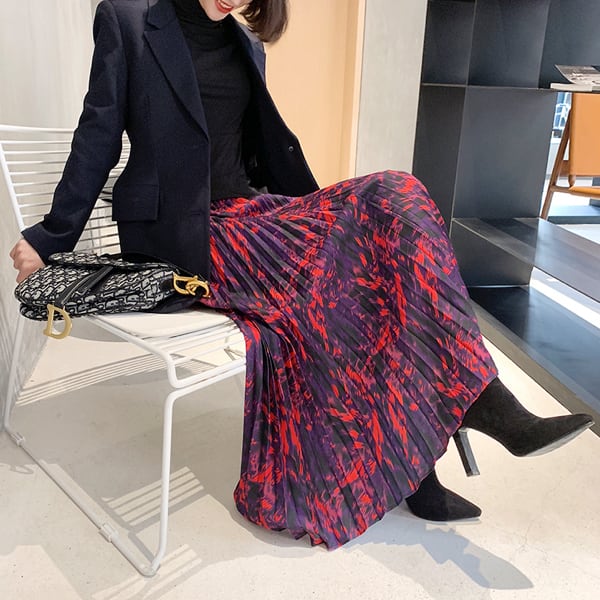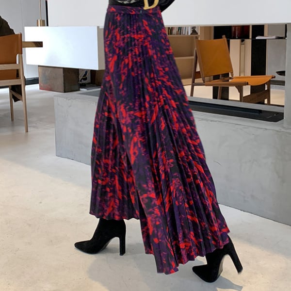 赤と紫の色の組合せが大人っぽいタイダイプリーツスカート。落ち着いた色味が、大人カッコよく着こなせます。タイダイファッションは春~夏のイメージですが、秋~冬でも合わせやすいカラーなので通年着回しもOK。細めのプリーツデザインなので綺麗めにコーデにも合わせやすい1枚です。