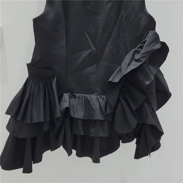 テーラードに個性的なラッフルデザインが目をひくベスト。ラッフルの裾は、きりっぱなしのヴィンテージテイスト。カジュアルなデザインのブラックジレなので、スマートに着こなせる1枚です。