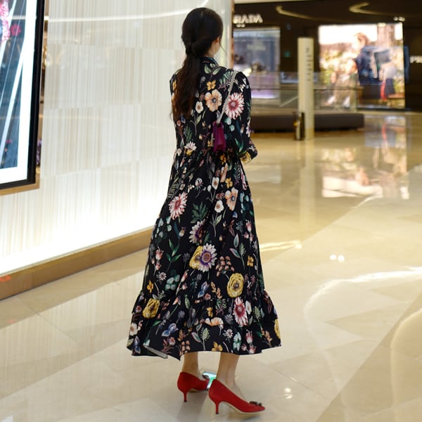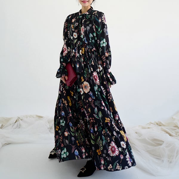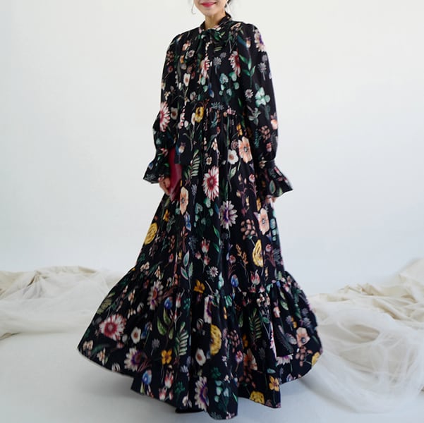 動くと裾がふわっと広がる華やかなドレスです。色々なカラーの花柄がプリントされているので、ベースが黒でも重たくならず1着でコーデが完成する優れもの。首元はボウタイ付きでクラシカルな印象に。合わせる小物は差し色を選べばコーデの質がグッと上がります。ホテルでのランチやアフタヌーンティーにぴったりの商品です。
