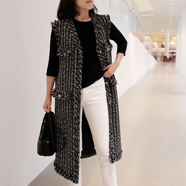 秋~冬にピッタリなツイードロングジレです。トレンドのツイードデザイン&ロング丈が人気のベスト。ロング丈なのでパンツと合わせても◎。スキニーやテーパードパンツと合わせて綺麗めに、デニムで大人カジュアルに。ブラックの生地にゴールドのボタンがアクセント。肩や裾はフリンジデザインなのでキッチリしすぎず、お洒落度がアップします。
