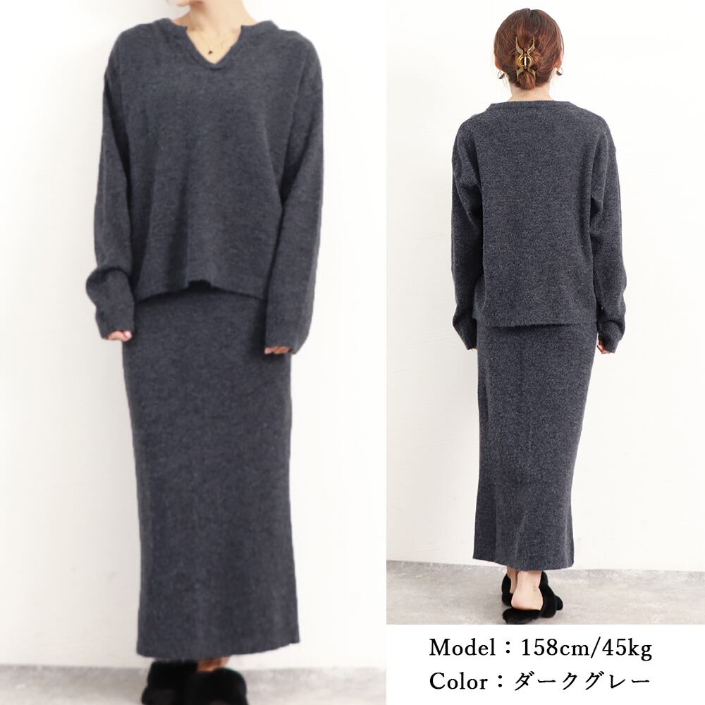 トップスはゆるシルエットにボトムスはタイトスカートで絶妙バランスコーデ。柔らかな肌触りのニット素材で仕上げて、ストレスフリーで着用できます。着るだけで今っぽく仕上がり、忙しい朝も即コーディネートが完成する優れもの。セットアップとしてはもちろん、それぞれ単体でも使えるため、着回し力抜群のアイテムです。