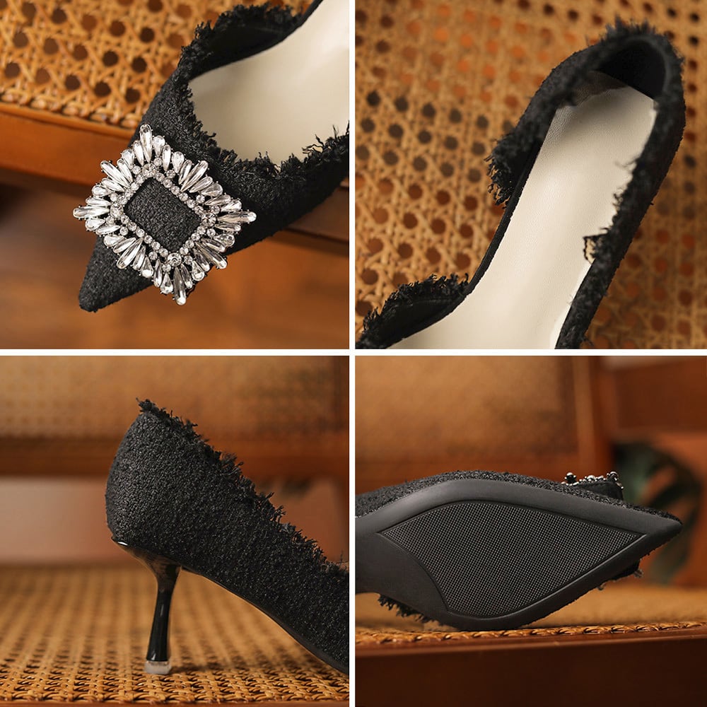フリンジのデザインがお洒落なツイード素材パンプス。ポインテッドトゥが足元をキレイに見せて、甲部分にはラインストーンを施したモチーフが輝きを放ちます。結婚式や卒入学式、二次会などのパーティーシーンにも足元を華やかしてくれる1足です。
