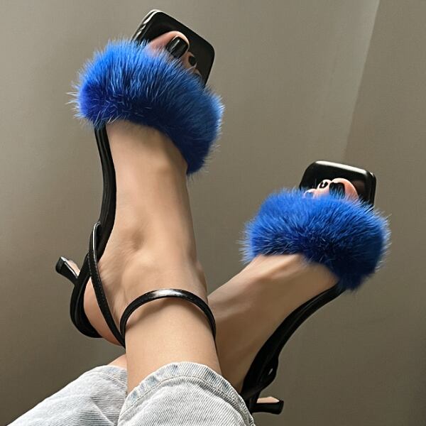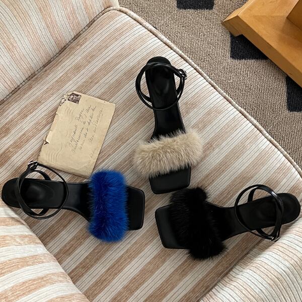 スクエアトゥ ファー アンクルストラップ サンダル 225726