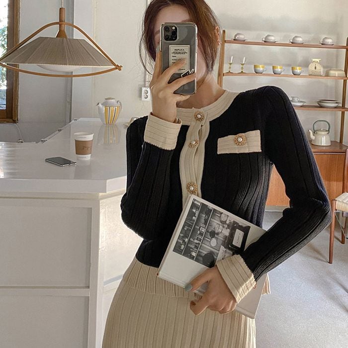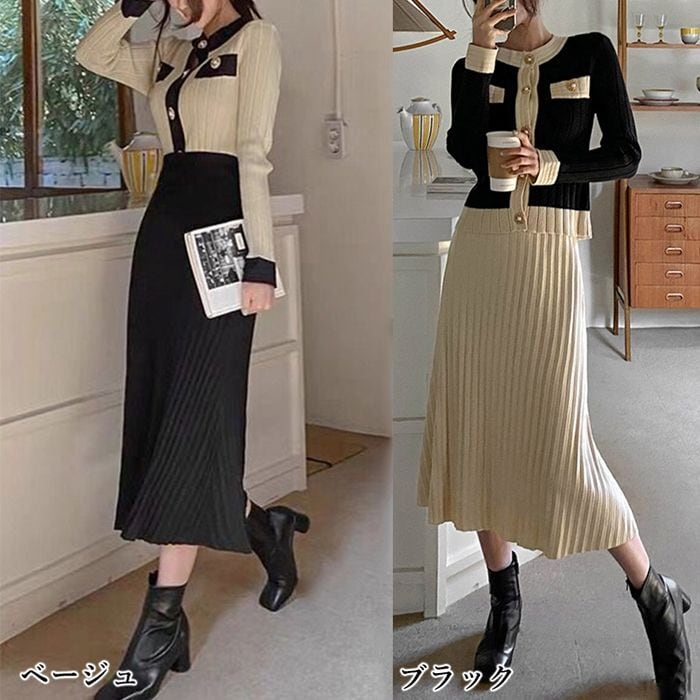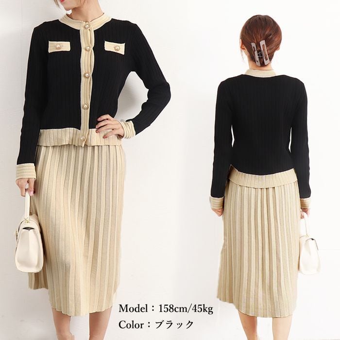 【即納】バイカラー ニット カーディガン& プリーツスカート セットアップ 227372