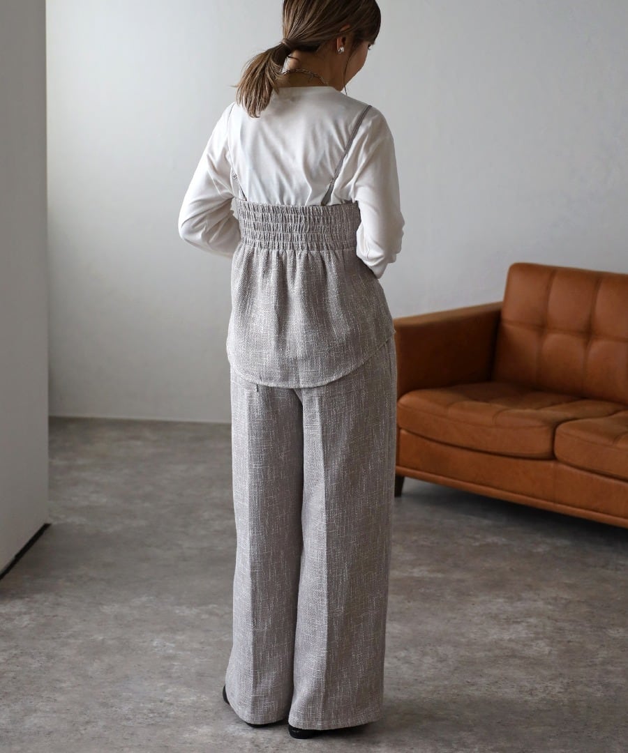 ざっくりとしたサマーツイードの素材で上品な大人スタイルに決まる、豪華な2点セット。トップスは細ストラップが可愛いキャミソールで、ストラップを取り外すとベアビスチェとしても着用が可能です。バックスタイルはシャーリングデザインになっており、後ろ姿までかわいらしい印象。1枚ではもちろん、Tシャツと合わせると旬なレイヤードコーデが完成します。同素材のパンツはバックゴムでフィット感があり、サイドファスナーで着脱も楽々。セットアップでの着用はもちろん、それぞれ別のアイテムと組み合わせても使える優秀セットアップ。お出かけやオフィススタイルなど、様々なシーンで活躍してくれること間違いなしです。