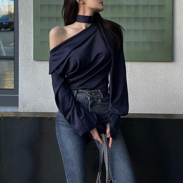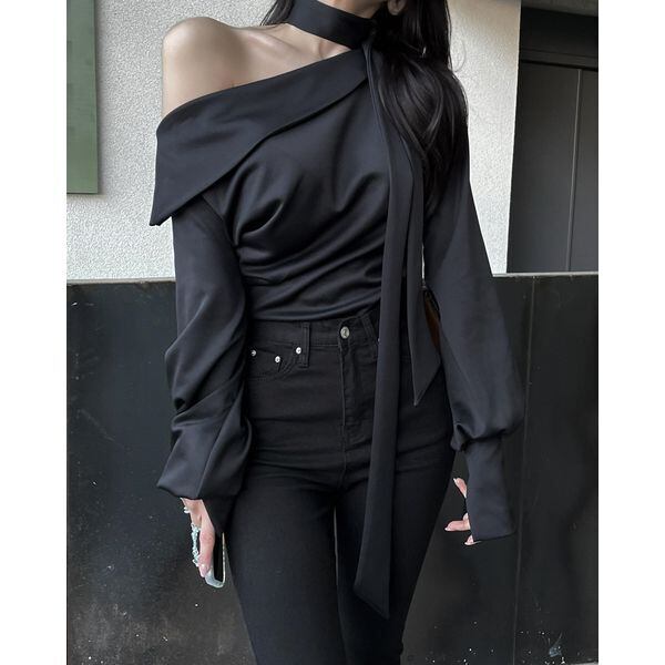 ワンショルダー ボウタイ サテン ブラウス 230504