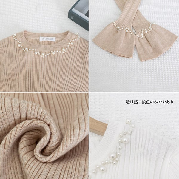 ネックラインと腕周りのパールデザインが上品で目を惹き、トレンド感満載のリブニットトップス。程よくフィットするデザインとふんわり広がるフレアスリーブが、絶妙なメリハリシルエットを作り出し、華奢見せを演出します。一枚で着映え、インナーとしてレイヤードスタイリングにも幅広く活躍するトレンドライクなアイテムです。